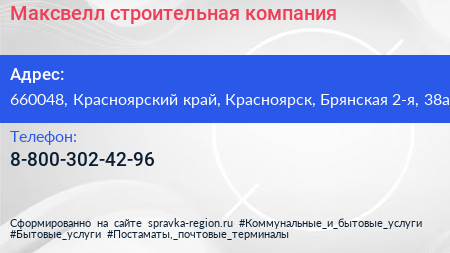 Максвелл, строительная компания по адресу 660048, Красноярский край, Красноярск, Брянская 2-я, 38а в дальнейшем Организация, размещена в следующих категориях: