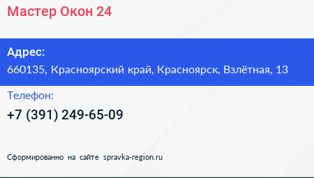 Мастер Окон 24 по адресу 660135, Красноярский край, Красноярск, Взлётная, 13 в дальнейшем Организация, размещена в следующих категориях: