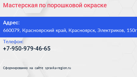 Мастерская по порошковой окраске по адресу 660079, Красноярский край, Красноярск, Электриков, 150г в дальнейшем Организация, размещена в следующих категориях: