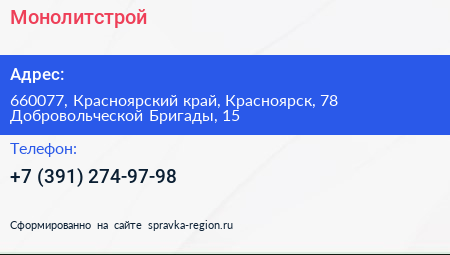 Монолитстрой по адресу 660077, Красноярский край, Красноярск, 78 Добровольческой Бригады, 15 в дальнейшем Организация, размещена в следующих категориях: