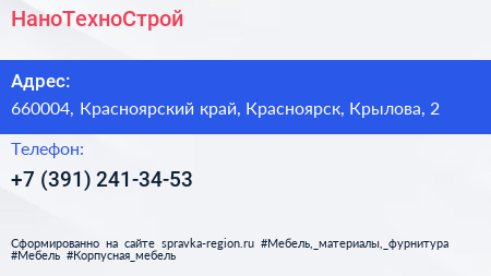НаноТехноСтрой по адресу 660004, Красноярский край, Красноярск, Крылова, 2 в дальнейшем Организация, размещена в следующих категориях: