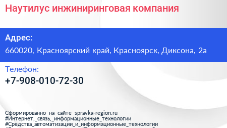 Наутилус, инжиниринговая компания по адресу 660020, Красноярский край, Красноярск, Диксона, 2а в дальнейшем Организация, размещена в следующих категориях: