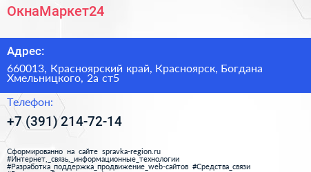 ОкнаМаркет24 по адресу 660013, Красноярский край, Красноярск, Богдана Хмельницкого, 2а ст5 в дальнейшем Организация, размещена в следующих категориях: