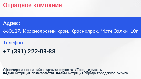 Отрадное, компания по адресу 660127, Красноярский край, Красноярск, Мате Залки, 10г в дальнейшем Организация, размещена в следующих категориях: