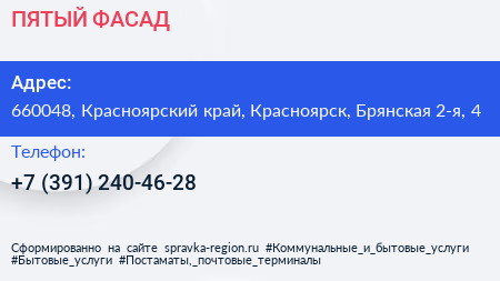 ПЯТЫЙ ФАСАД по адресу 660048, Красноярский край, Красноярск, Брянская 2-я, 4 в дальнейшем Организация, размещена в следующих категориях: