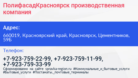 ПолифасадКрасноярск, производственная компания по адресу 660019, Красноярский край, Красноярск, Цементников, 59Б в дальнейшем Организация, размещена в следующих категориях:
