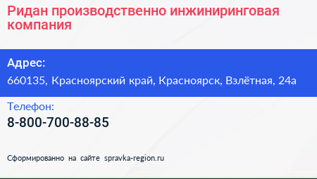 Ридан, производственно-инжиниринговая компания по адресу 660135, Красноярский край, Красноярск, Взлётная, 24а в дальнейшем Организация, размещена в следующих категориях: