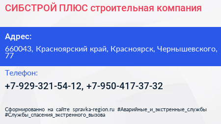 СИБСТРОЙ ПЛЮС, строительная компания по адресу 660043, Красноярский край, Красноярск, Чернышевского, 77 в дальнейшем Организация, размещена в следующих категориях: