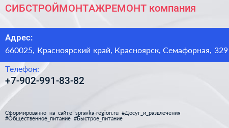 СИБСТРОЙМОНТАЖРЕМОНТ, компания по адресу 660025, Красноярский край, Красноярск, Семафорная, 329 в дальнейшем Организация, размещена в следующих категориях: