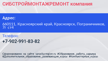 СИБСТРОЙМОНТАЖРЕМОНТ, компания по адресу 660111, Красноярский край, Красноярск, Пограничников, 7г ст4 в дальнейшем Организация, размещена в следующих категориях: