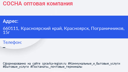 СОСНА, оптовая компания по адресу 660111, Красноярский край, Красноярск, Пограничников, 15г в дальнейшем Организация, размещена в следующих категориях: