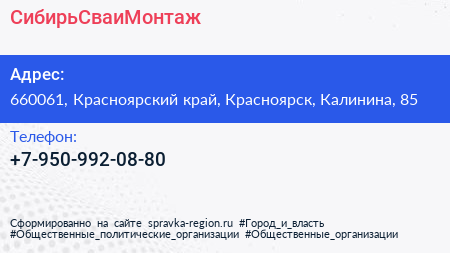 СибирьСваиМонтаж по адресу 660061, Красноярский край, Красноярск, Калинина, 85 в дальнейшем Организация, размещена в следующих категориях: