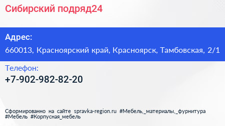 Сибирский подряд24 по адресу 660013, Красноярский край, Красноярск, Тамбовская, 2/1 в дальнейшем Организация, размещена в следующих категориях: