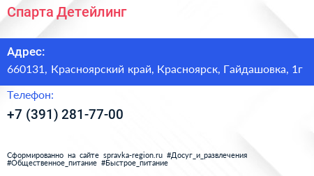 Спарта Детейлинг по адресу 660131, Красноярский край, Красноярск, Гайдашовка, 1г в дальнейшем Организация, размещена в следующих категориях:
