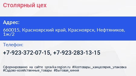 Столярный цех по адресу 660015, Красноярский край, Красноярск, Нефтяников, 1ж/2 в дальнейшем Организация, размещена в следующих категориях: