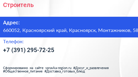 Строитель по адресу 660052, Красноярский край, Красноярск, Монтажников, 58 в дальнейшем Организация, размещена в следующих категориях: