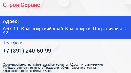 Строй-Сервис по адресу 660111, Красноярский край, Красноярск, Пограничников, 42 в дальнейшем Организация, размещена в следующих категориях: