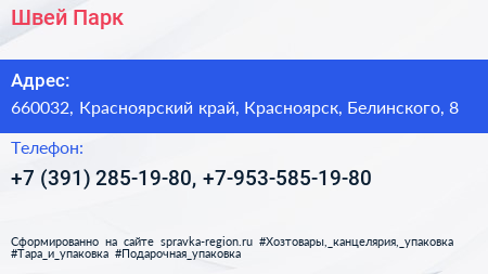 Швей-Парк по адресу 660032, Красноярский край, Красноярск, Белинского, 8 в дальнейшем Организация, размещена в следующих категориях: