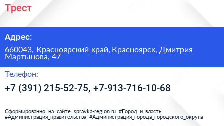 Трест по адресу 660043, Красноярский край, Красноярск, Дмитрия Мартынова, 47 в дальнейшем Организация, размещена в следующих категориях: