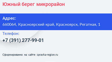 Южный берег, микрорайон по адресу 660064, Красноярский край, Красноярск, Регатная, 1 в дальнейшем Организация, размещена в следующих категориях: