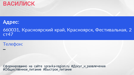 ВАСИЛИСК по адресу 660031, Красноярский край, Красноярск, Фестивальная, 2 ст47 в дальнейшем Организация, размещена в следующих категориях: