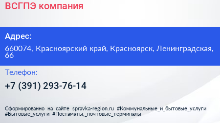 ВСГПЭ, компания по адресу 660074, Красноярский край, Красноярск, Ленинградская, 66 в дальнейшем Организация, размещена в следующих категориях:
