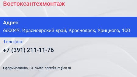 Востоксантехмонтаж по адресу 660049, Красноярский край, Красноярск, Урицкого, 100 в дальнейшем Организация, размещена в следующих категориях: