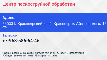 Центр пескоструйной обработки по адресу 660031, Красноярский край, Красноярск, Айвазовского, 16 ст3 в дальнейшем Организация, размещена в следующих категориях: