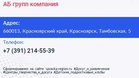 АБ-групп, компания по адресу 660013, Красноярский край, Красноярск, Тамбовская, 5 в дальнейшем Организация, размещена в следующих категориях:
