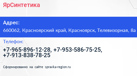 ЯрСинтетика по адресу 660062, Красноярский край, Красноярск, Телевизорная, 8а в дальнейшем Организация, размещена в следующих категориях: