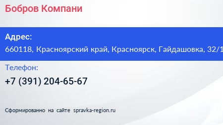 Бобров Компани по адресу 660118, Красноярский край, Красноярск, Гайдашовка, 32/1 в дальнейшем Организация, размещена в следующих категориях: