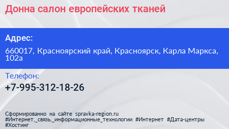 Донна, салон европейских тканей по адресу 660017, Красноярский край, Красноярск, Карла Маркса, 102а в дальнейшем Организация, размещена в следующих категориях: