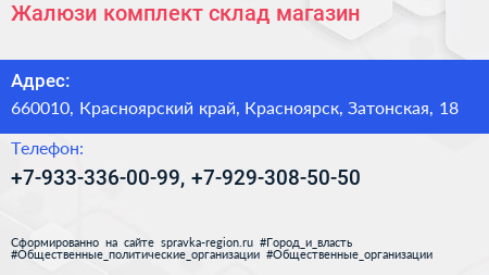 Жалюзи-комплект, склад-магазин по адресу 660010, Красноярский край, Красноярск, Затонская, 18 в дальнейшем Организация, размещена в следующих категориях: