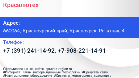 Красалютех по адресу 660064, Красноярский край, Красноярск, Регатная, 4 в дальнейшем Организация, размещена в следующих категориях: