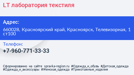 LT, лаборатория текстиля по адресу 660028, Красноярский край, Красноярск, Телевизорная, 1 ст100 в дальнейшем Организация, размещена в следующих категориях: