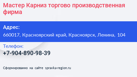 Мастер Карниз, торгово-производственная фирма по адресу 660017, Красноярский край, Красноярск, Ленина, 104 в дальнейшем Организация, размещена в следующих категориях: