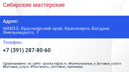 Сибирские мастерские по адресу 660013, Красноярский край, Красноярск, Богдана Хмельницкого, 7 в дальнейшем Организация, размещена в следующих категориях: