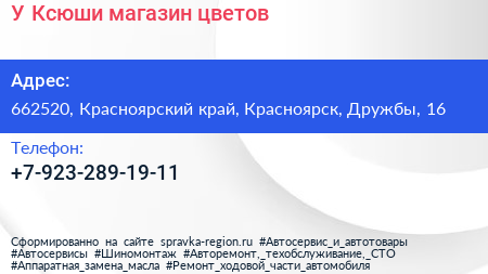 У Ксюши, магазин цветов по адресу 662520, Красноярский край, Красноярск, Дружбы, 16 в дальнейшем Организация, размещена в следующих категориях: