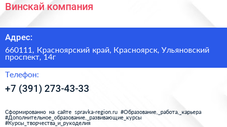 Винскай, компания по адресу 660111, Красноярский край, Красноярск, Ульяновский проспект, 14г в дальнейшем Организация, размещена в следующих категориях: