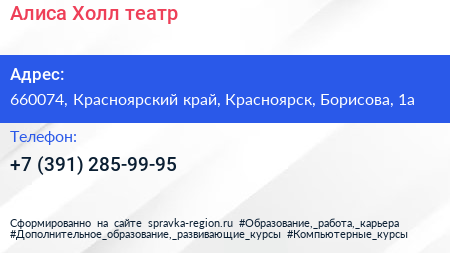Алиса Холл, театр по адресу 660074, Красноярский край, Красноярск, Борисова, 1а в дальнейшем Организация, размещена в следующих категориях: