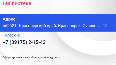 Библиотека по адресу 662521, Красноярский край, Красноярск, Сурикова, 12 в дальнейшем Организация, размещена в следующих категориях: