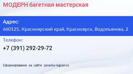 МОДЕРН, багетная мастерская по адресу 660125, Красноярский край, Красноярск, Водопьянова, 2 в дальнейшем Организация, размещена в следующих категориях:
