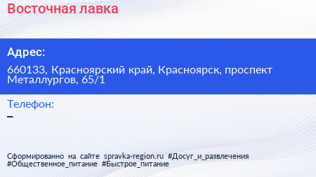 Восточная лавка по адресу 660133, Красноярский край, Красноярск, проспект Металлургов, 65/1 в дальнейшем Организация, размещена в следующих категориях: