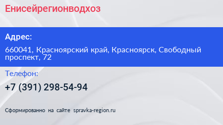 Енисейрегионводхоз по адресу 660041, Красноярский край, Красноярск, Свободный проспект, 72 в дальнейшем Организация, размещена в следующих категориях: