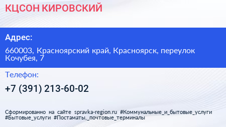 КЦСОН КИРОВСКИЙ по адресу 660003, Красноярский край, Красноярск, переулок Кочубея, 7 в дальнейшем Организация, размещена в следующих категориях: