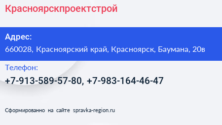 Красноярскпроектстрой по адресу 660028, Красноярский край, Красноярск, Баумана, 20в в дальнейшем Организация, размещена в следующих категориях: