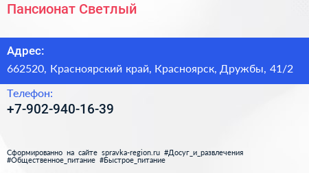 Пансионат Светлый по адресу 662520, Красноярский край, Красноярск, Дружбы, 41/2 в дальнейшем Организация, размещена в следующих категориях: