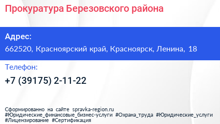 Прокуратура Березовского района по адресу 662520, Красноярский край, Красноярск, Ленина, 18 в дальнейшем Организация, размещена в следующих категориях:
