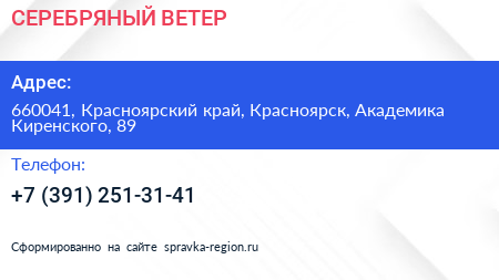 СЕРЕБРЯНЫЙ ВЕТЕР по адресу 660041, Красноярский край, Красноярск, Академика Киренского, 89 в дальнейшем Организация, размещена в следующих категориях: