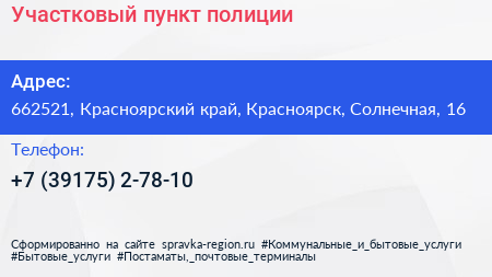 Участковый пункт полиции по адресу 662521, Красноярский край, Красноярск, Солнечная, 16 в дальнейшем Организация, размещена в следующих категориях: